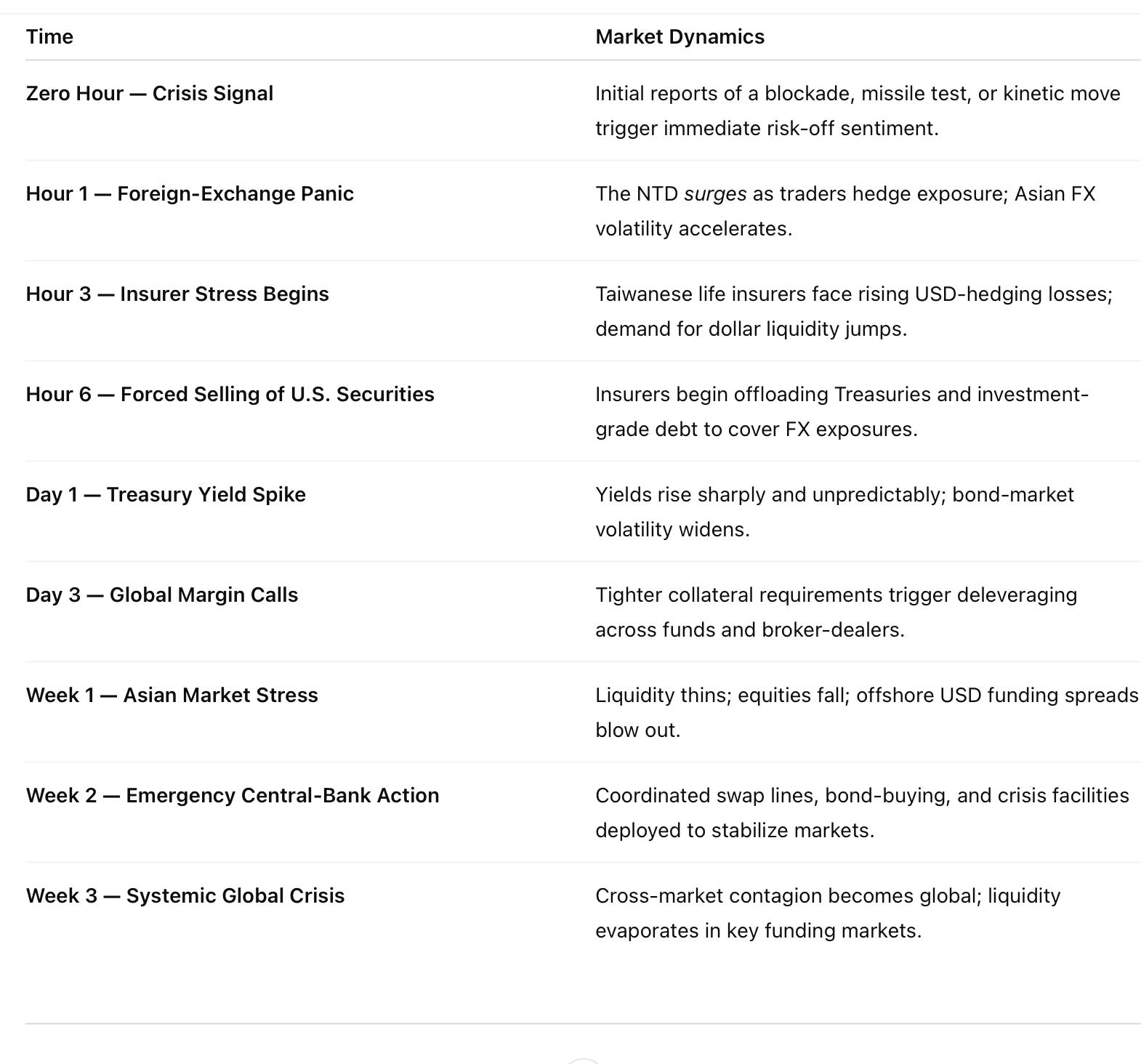 What makes this dynamic especially destabilizing is that global markets would interpret Taiwan’s forced selling not as a local liquidity event but as a signal that Taiwanese institutions are reacting to imminent geopolitical risk. In an environment where algorithms and macro funds are trained to chase flows, the sudden liquidation of hundreds of billions in U.S. fixed-income assets would be read as a warning shot. This could trigger copycat de-risking by global investors, widening credit spreads, dumping duration, and amplifying volatility across asset classes long before any conflict materializes.